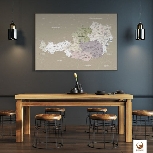 Leinwandbild - Österreichkarte Grau Sand - Pinnwand, Deutsch|Canvas Art - Austria Grey Sand - Pinboard, German