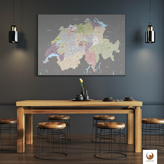 Leinwandbild - Schweizkarte Graphit Grau - Pinnwand, Deutsch|Canvas Art - Switzerland Graphite Grey - Pinboard, German