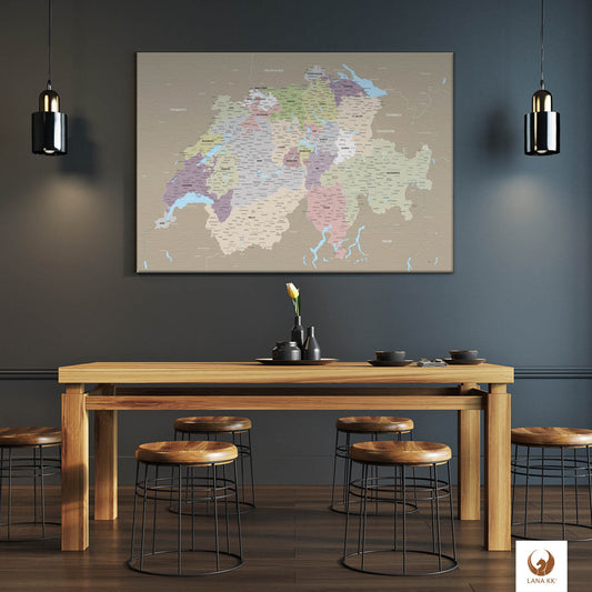 Leinwandbild - Schweizkarte Grau Sand - Pinnwand, Deutsch|Canvas Art - Switzerland Grey Sand - Pinboard, German