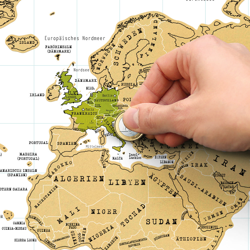 Die Rubbelkarten von Luckies of London funktionieren wie ein einfaches Rubbellos. Nimm die Weltkarte aus der mitgelieferten Geschenkverpackung, lege sie auf einen ebene Fläche und beginne, mit einem harten Gegenstand, deine bereisten Orte freizulegen. Du kannst hierfür am besten eine alte Münzen oder einen Radiergummi nutzen.